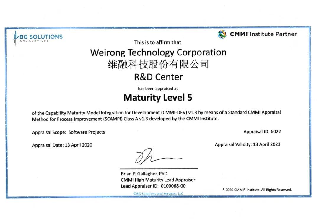 2020年4月13日,維融科技股份有限公司正式通過CMMI5級評估認證,標志著公司在軟件過程組織、技術(shù)研發(fā)、項目管理、方案交付等方面達到了國際先進水平。?